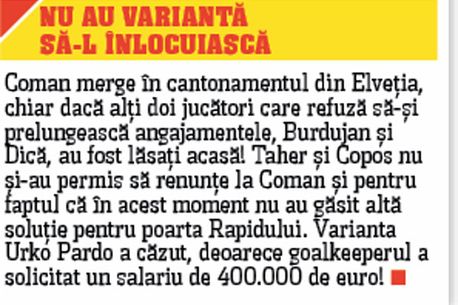 Coman merge în cantonamentul din Elveția, chiar dacă alți doi jucători care refuză să-și prelungească angajamentele, Burdujan și Dică, au fost lăsați acasă! Taher și Copos nu și-au permis să renunțe la Coman și pentru faptul că în acest moment nu au găsit altă soluție pentru poarta Rapidului. Varianta Urko Pardo a căzut, deoarece goalkeeperul a solicitat un salariu de 400.000 de euro!