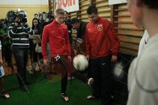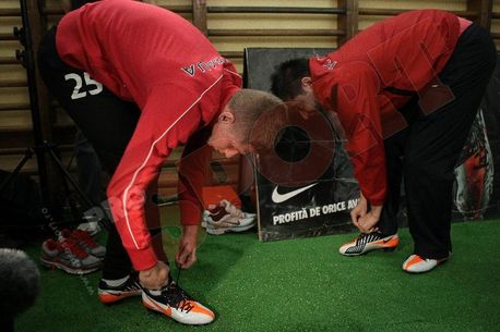 „FCD în ADN”! Cu acest mesaj au fost primiți fotbaliștii Stelei în sala de sport a Liceului „Sfântul Sava”, cu numai două etape înaintea meciului cu rivala Dinamo. Portarul uneia dintre echipele liceului își mâzgălise pe spatele tricoului mesajul, în speranța că îi va timora pe steliști. Totuși, Tănase (foto dreapta), Rusescu și Roșu (foto sus) nu s-au supărat și au acceptat cuminți cererile de poze și autografe venite în special din partea fetelor.