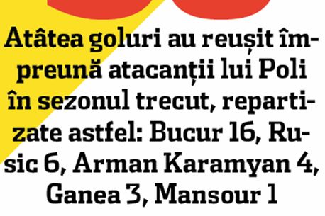 30 Atâtea goluri au reușit împreună atacanții lui Poli în sezonul trecut, repartizate astfel: Bucur 16, Rusic 6, Arman Karamyan 4, Ganea 3, Mansour 1