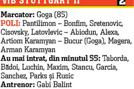 Cea mai proastă veste din prima repriză n-a fost deschiderea scorului de către Stuttgart, ci accidentarea golgheterului Bucur, schimbat de Goga în minutul 22. Atacantul a fost loÂvit de un adversar, iar în cursul zilei de astăzi medicii vor da verdictul după lovitura de mușchi încasată. Și postul de fundaș central i-a dat bătăi de cap lui Balint, acesta schimbându-l pe Sretenovic la pauză cu Rațiu, iar pe acesta din urmă cu Aldana, pentru ultimul sfert de oră.
