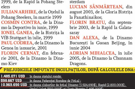 Cutremur fără precedent în fotbalul românesc: procurorii din cadrul Direcției Naționale Anticorupție au decis ieri trimiterea în judecată a opt inculpați în legătură cu transferurile unor fotbaliști către cluburi din străinătate. Conform anchetatorilor DNA, prejudiciul total este unul uriaș, de aproape 1,5 milioane USD în dauna statului și de peste 10 milioane USD în dauna a patru cluburi de fotbal. O parte din