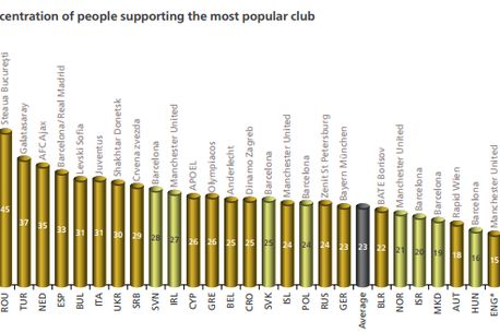 Potrivit forului de la Nyon, 45% dintre microbiștii români susțin Steaua, cu doar două puncte procentuale mai puțin decât Benfica Lisabona, echipă susținută de 47% dintre pasionații portughezi de fotbal. La mare distanță, podiumul este completat de Galatasaray, care întrunește 37% dintre preferințele microbiștilor turci. În ceea ce privește campionatele puternice din Europa, Spania se află pe locul 5 în topul citat, Barcelona și Real Madrid având fiecare câte 33% din preferințele microbiștilor iberici. În Italia, aproape o treime dintre microbiști (31%) o susțin pe Juventus, în timp ce doar 23% dintre nemți au ca echipă favorită pe Bayern Munchen.