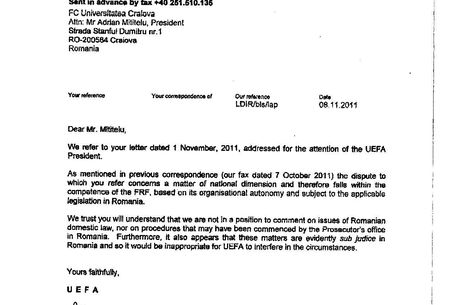 „Așa cum v-am menționat și în corespondența precedentă, litigiul este de dimensiune națională și este în competența FRF, ținând cont de legislația română în vigoare. Avem încredere că veți înțelege faptul că nu suntem în măsură să comentăm nici aspectele legate de legislația naționala din România, nici procedurile care au fost inițiate de DNA. Mai mult, aceste probleme se judecă în România, așa că nu este indicat ca UEFA să intervină în acest caz”