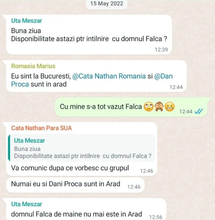 „Semnale au existat în acest sens pe la mijlocul lunii mai. Alexandru Meszar a dat în scris că acceptă oferta, dar decizia nu este la el. Acum, nu știu, așteptăm lamuriri…De la Falcă, dacă el este cel care a sabotat totul, sau, poate, e invenția lui Meszar. Dar, până la urmă, nu e important cine a decis, vrem să se revină la masa negocierilor pentru binele UTA-ei, Meszar a spus că dorește liniște, acum nu este liniște, acel comunicat de miercuri a aruncat totul în aer”, a adăugat conducătorul SCU, care a oferit și o poză cu convorbirea cu Meszar, în care aceasta îi îndeamnă pe investitorii arădeni să ia legătura neapărat cu Gheorghe Falcă.