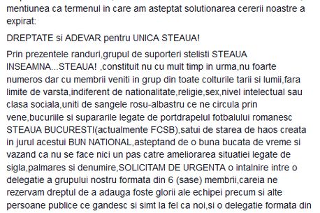 Un grup de suporteri steliști cere dezafilierea FRF, dacă MApN nu va lămuri situația clubului de fotbal Steaua. Grupul „Steaua înseamnă Steaua” cere transparență și declarații din partea MApN care să fie susținute de documente.