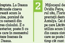 De când a revenit la roș-albaștri, Marius Lăcătuș a dorit să dea mai mult dinamism jocului și a trecut la sistemul 4-1-4-1, care nu diferă prea mult de cel utilizat anul trecut, dar care conferă, cel puțin teoretic, mai multe șanse jucătorilor ofensivi de a marca. Acest lucru s-a observat în meciurile din Antalya, unde jucători precum Dayro Moreno, Pedriel sau Stancu au reușit să înscrie. Numai Kapetanos nu. De ce? Pentru că Lăcătuș i-a încredițat grecului rolul avut în tur de Arthuro, un „turn de control“ care să devieze baloane pentru mijlocașii ofensivi care vin din linia a doua. Singura șansă a vârfului să marcheze e la fazele fixe, unde Kapetanos nu a avut noroc în Antalya. A fost prea izolat și nesusținut îndeajuns de colegii din linia mediană. 4-1-4-1 este modulul pe care Lăcătuș a dorit să-l folosească încă din vara trecută, dar dubla manșă cu Galatasaray bătea la ușă, iar jucătorii dădeau semne că nu se adaptează. Nici după cele două cantonamente din Spania și Turcia nu se poate spune că fotbaliștii steliști au învățat bine noile cerințe și, astfel, Steaua riscă să înceapă returul cu lecția neînvățată.