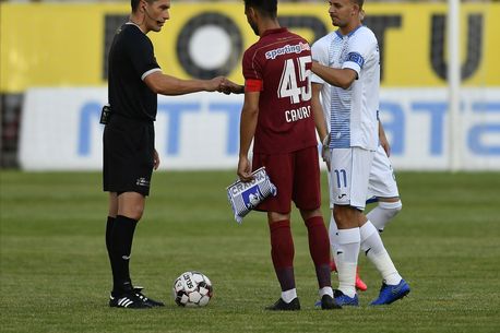 Mario Camora si Dan Nistor in meciul de fotbal dintre Universitatea Craiova si CFR Cluj, contand pentru play-off-ul Ligii 1 Casa Pariurilor, disputat fara spectatori pe Stadionul Ion Oblemenco din Craiova, luni 3 august 2020. © FOTO:Razvan Pasarica/SPORT PICTURES