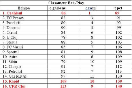 În întocmirea ierarhiei trofeului Fair-Play s-a punctat 1 pct-cartonașul gaben și 3 pct.cartonașul roșu.