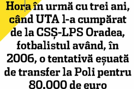 Oferta exista de mai multă vreme, dar Nicolae Bara, patronul UTA, a aprobat-o numai după ce a primit și acordul lui Ionuț Chirilă. „Antrenorul are mână liberă în alcătuirea lotului. Mi-a spus că Hora nu este indispensabil în noua construcție și abia apoi am acceptat oferta bistrițenilor”, a explicat Nicolae Bara. Pentru că Ionuț Chirilă i-a garantat promovarea echipei în Liga I peste un an, Nicolae Bara a fost de acord să-i ofere tehnicianului ultimul cuvânt în privința transferurilor.