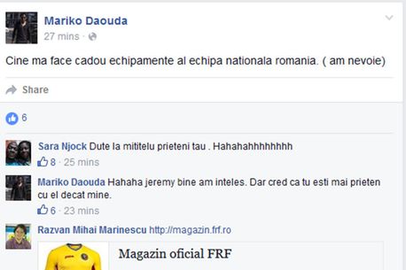 În această dimineață, Daouda a postat pe contul său de Facebook o rugăminte: jucătorul ivorian i-a întrebat pe prietenii săi virtuali dacă îl pot ajuta cu un echipament al naționalei României, dar a fost imediat „luat în primire” de N’Jock.