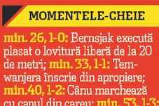 Oaspeții au apăsat ușor-ușor pe accelerație, iar Gabriel Cânu a liniștit apele înainte de pauză, marcând cu capul după o ieșire nefericită a lui Cristi Brăneț. Marko Ljubinkovic a adus zâmbetul pe fața încrâncenatului Viorel Hizo, fâcând 3-1 și, spre surprinderea tuturor, Ionuț Popa a forțat aruncându-și în atac toți jucătorii cu profil ofensiv. Alb-albaștrii s-au zbătut însă în zadar între liniile adverse, nereușind nicio clipă să alunge impresia unei echipe neputincioase în fața unei grupări superioare.