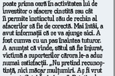 În România? După șase luni de la mediatizatul moment, patronul care își trimitea oamenii în inima Ardealului cu milioane de euro la ei pentru trei palme sau puncte de… pământ ori alte „titluri” de proprietate, împarte la trei și ceva prima înaintea unui derby. De la 10.000 de euro la 3.000. Fără precedent.