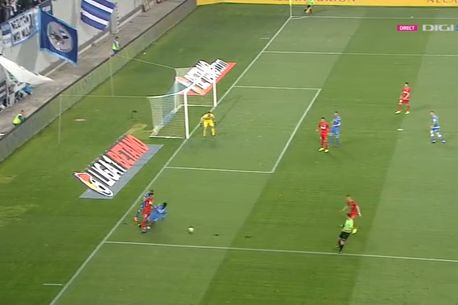Minutul 60 Ce decizie greșită a lui Man! Tănase l-a lăsat singur cu Pigliacelli, Man nu și-a acoperit bine intenția de a-l loba pe portarul advers, acesta din urmă nu se pune pe jos și prinde în siguranță mingea trimisă de adversar.
