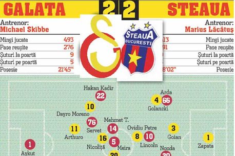 Multe nonsensuri în logica de miercuri a lui Skibbe. A mizat pentru axul central numai la jucători lenți sau foarte lenți. Este vorba de fundașii centrali, Servet și Emre Așik, și de mijlocașii defensivi Meira și Mehmet. În aceste condiții, presingul agresiv al Stelei a dat roade. În fine, doi mijlocași defensivi pentru Galata au fost inutili, în condițiile în care și Steaua a jucat tot 4-2-3-1, iar turcii trebuiau să atace. Lui Skibbe i-ar fi fost mai folositor un al doilea mijlocaș ofensiv în centru, lângă Lincoln. S-a prins abia la pauză, înlocuindu-l în minutul 50 pe Mehmet cu özbek.