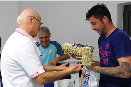 La antrenamentul de astăzi, jucătorii de la CS Universitatea Craiova au avut parte de o surpriză extrem de plăcută, renumitul artist craiovean Tudor Gheorghe onorându-I cu prezența. Maestrul i-a încurajat pe alb-albaștri, ținându-le un discurs despre ce înseamnă performanța și valorile, oferindu-I ca exemplu atât pe antrenorii lor, componenții Craiovei Maxima, cât și pe sine. Artistul, care recent a împlinit 70 de ani, a semnat în cartea de onoare a clubului și a primit din partea juveților un tricou personalizat, unul de joc și o minge.