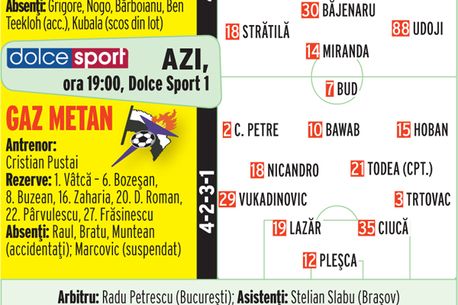 Gaz Metan Mediaș: Pleșca – Zaharia (Roman ’66), Fl. Lazăr, Frăsinescu, Vukadinovici – Hoban, Todea, Nicandro (Pârvulescu ’46), C. Petre – Bawab (Bozeșan ’72), Bud. Antrenor: Cristian Pustai.
