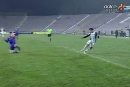 Captură a înregistrării de la DolceSport cu momentul în care balonul șutat de Ganea îl lovește în figură pe Belu. Arbitrul Hațegan este aproape de fază
