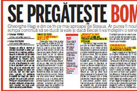 Gigi Becali le-a mărturisit apropiaților că nu va avea liniște până nu-i va oferi din nou, într-o zi, șansa lui Gică Hagi să conducă Steaua. În ediția de joia trecută (facsimil), ProSport a dezvăluit în exclusivitate bomba pe care o plănuiește finanțatorul stelist, adică pregătirea unei superoferte pentru Hagi în cazul în care Ilie Stan va duce echipa și mai jos.