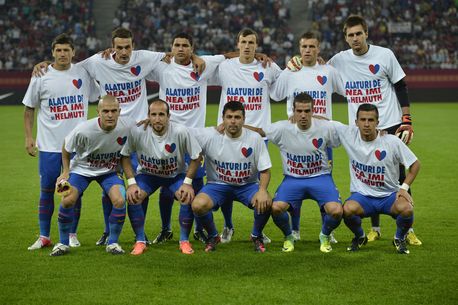 Tătărușanu (echipa actuală: Fiorentina) – Georgievski (Melbourne Victory), Szukala (Al Ittihad), Chiricheș (Tottenham), Latovlevici (Genclerbirligi) – Bourceanu (Trabzonspor), Pintilii (Hapoel Tel-Aviv) – Chipciu (Steaua), Rusescu (Sevilla), Tănase (Steaua) – Adi Rocha (Jiangxi Liansheng)