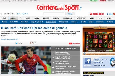 Jucătorul care se află cel mai aproape de Milan este Vlad Chiricheș, apărătorul celor de la Steaua București. Internaționalul român va fi achiziționat în această iarnă. Acerbi va pleca cel mai probabil la Genoa, în locul sau putând sosi Kucka. În schimbul românului Chiricheș, Milan va plăti 7 milioane de euro. Chiricheș ar urma să fie împrumutat până în vara lui 2013, iar apoi achiziționat”, scrie corrieredellosport.it.