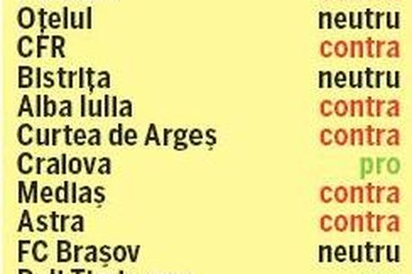 În tabăra adversă sunt, desigur, Urziceni și Cluj – care nu vor să piardă avantajul pe care-l au -, Aron Huzu (șeful arbitrilor), Mircea Sandu (șeful FRF) și destule alte cluburi din prima ligă.Â
