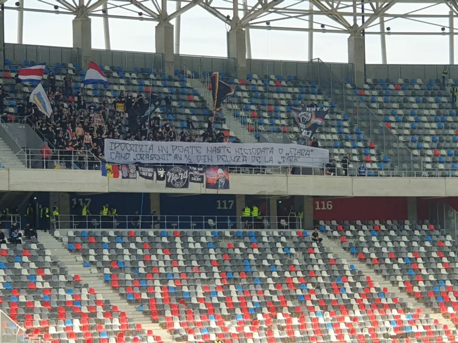 „Am ajuns în „Templul” fotbalului românesc, e atât de „templu” că mai toți steliștii îl ocolesc”, a fost banner-ul arătat de suporterii formației moldovene.