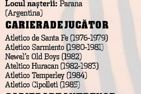 Are o poveste de viață mai mult decât atractivă și vorbește cu seninătate despre cum destinul l-a transformat din vedetă într-o victimă a problemelor economice din Argentina. „Am jucat în prima ligă din Argentina între 1976 și 1985. Eram atacant și am avut plăcerea de a evolua alături de Passarella, Hector Cuper, Luque sau Kempes. Am fost în multe meciuri și adversarul lui Maradona. Era unic“, povestește omul adus în România de Marius Vizer. Noul tehnician al lui Liberty Salonta s-a duelat în Argentina cu „El Pibe d’Oro“, pe care-l consideră unic.
