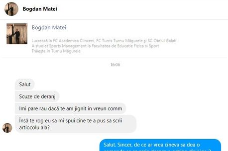 E vorba despre fundașul central Bogdan Matei (31 de ani), care n-a stat prea mult pe gânduri și i-a scris în privat jurnalistului Alin Grigore. Jucătorul a fost nemulțumit de faptul că în articolul de duminică a fost prezentat faptul că Valentin Dragnea i-a propus antrenorului Erik Lincar să-și dea demisia după eșecul cu Ripensia, scor 2-4. Mai mult, în aceeași știre se menționează că jucătorii se laudă în vestiar că au clipuri compromițătoare cu patronul Valentin Dragnea.