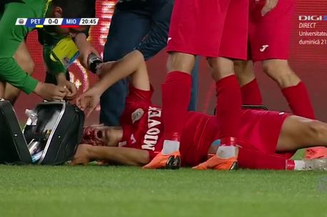 Accidentare groaznică pentru unul dintre jucătorii Mioveniului la meciul de la Ploiești, cu Petrolul, de pe stadionul „Ilie Oană”, disputat miercuri seară. La un banat duel aerian petrecut într-o zonă neutră a terenului, în jumătatea argeșenilor, la scorul de 0-0, mijlocașii Andrei Trașcu (21 de ani) și Marius Chindriș (27 de ani) s-au lovit cap în cap. Trașcu a ieșit mult mai rău după această fază, alegându-se cu nasul spart, cu fața plină de sânge, fiind scos de pe teren pe targă și înlocuit. Imagine surprinse de camerele TV sunt îngrozitoare.