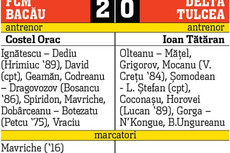 Acesta a fost, de altfel, și contextul în care s-a produs deschiderea de scor. Sergiu Mavriche a plecat ca din tun pe un culoar și a înscris cu un șut la colțul lung, după pasa excelentă a lui Vladimir Dragovozov. Oaspeții nu au contat deloc în atac, singurele zvâcniri aparținându-i lui Njohn N’Kongue, care a încercat să își pună în valoare viteza, și lui Liviu Ștefan, care l-a “încercat” pe Viorel Ignătescu cu două șuturi de la distanță. Cu un sfert de oră înaintea fluierului final, Costel Orac a mutat decisiv, introducându-l pe teren pe Florin Petcu (foto), iar “venerabilul” atacant băcăuan nu i-a înșelat încrederea. După o fază prelungită de atac, mingea retrimisă pe spate de Dan Spiridon a fost respinsă cu greutate de un fundaș al Deltei, iar Florin Petcu, apărut parcă de nicăieri, a trimis balonul în plasă, cu toată opoziția apărătorilor adverși, stabilind scorul final.