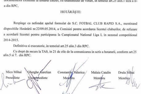 UPDATE 23:00 Aceasta este hotărârea pe care oficialii clubului Rapid au primit-o în decursul zilei de astăzi, prin care erau anunțați că nu au primit licența. În următoarele 21 de zile, giuleștenii vor putea să se adreseze la TAS.