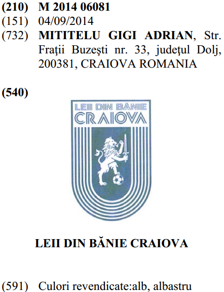 „CLUBUL SPORTIV UNIVERSITATEA CRAIOVA, contestă Decizia OSIM nr. M 2014 06081/26.01.2015 de admitere la înregistrare a mărcii LEII DIN BĂNIE CRAIOVA nr.depozit M 2014 06081, intimaţi-solicitanţi FC U CRAIOVA SA, prin ADMINISTRATOR JUDICIAR PREST INSOLV IPURL şi ASOCIAŢIA COMUNITATEA SUPORTERILOR FC UNIVERSITATEA CRAIOVA, şi intimat-intervenient PELUZA SUD. RESPINGE EXCEPŢIILE. ADMITE CONTESTAŢIA” se precizează în decizia Comisiei de Contestaţie a Mărcilor din cadrul Oficiului de Stat pentru Invenţii şi Mărci.