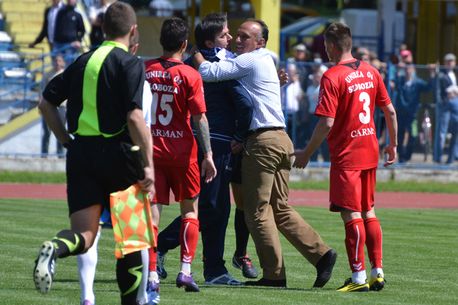 Florin Prunea, a intervenit pentru a-și calma antrenorul, pe Marius Lăcătuș, la finalul meciului din Copou cu Unirea Slobozia. Atunci, tehnicianul a sărit să-l bată pe Cătălin Hristian, jucători la ialomițeni. Foto: Petronel Tudor