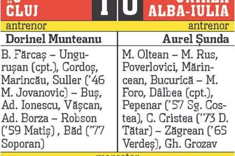 Dorinel Munteanu și Aurel Șunda s-au întâlnit pentru a treia oară din postura de adversari după ce au pregătit, pe rând, pe CFR Cluj. Ieri, a învins Dorinel, iar „U“ a obținut primul succes acasă din acest sezon. Miza întâlnirii de sub Feleac cu Universitatea Cluj parcă le-a întunecat mințile fotbaliștilor albaiulieni. Altfel nu se poate explica gestul oaspeților din prelungirile partidei, când, la scorul de 1-0, Buș a cedat posesia mingii pentru ca Borza să primească îngrijiri medicale. La reluare, oaspeții nu au returnat balonul, ci au atacat poarta clujeană în căutarea golului egalizator. Un gest care a aruncat în aer ambele bănci tehnice.