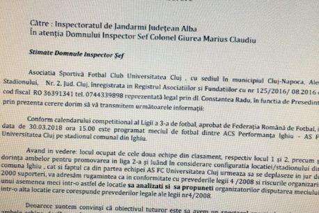 „Considerăm că amplasamentul actual al bazei din Ighiu, tribunele, vestiarele și suprafața de joc, precum și tot ceea ce presupune Regulamentul de organizare a activității fotbalistice aprobat de FRF, nu recomandă acest meci de fotbal la Ighiu”, se arată în documentul trimis de clujeni către Inspectoratul Județean de Jandarmi Alba.