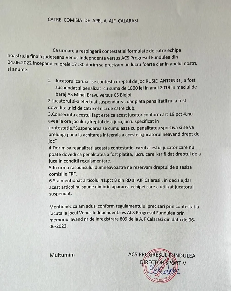 Progresul Fundulea a depus contestația la AJF Călărași, însă Asociația Județeană a respins-o. A doua zi, oficialii celor din Fundulea au depus o nouă contestație, însă și aceasta a fost respinsă pe motiv că Progresul Fundulea n-a adus dovada că jucătorul în cauză a evoluat în campionatele AJF Călărași.