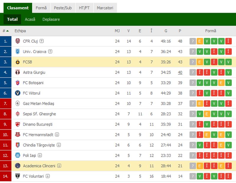 Astfel, FCSB nu a putut profita de pasul greșit făcut de către liderul CFR Cluj la Mediaș, scor 0-0 cu Gaz Metan și rămâne la cinci puncte distanță de ardeleni, pe locul 3. La egalitate de puncte (43) cu roș-albaștrii se află Universitatea Craiova, pe locul 2.