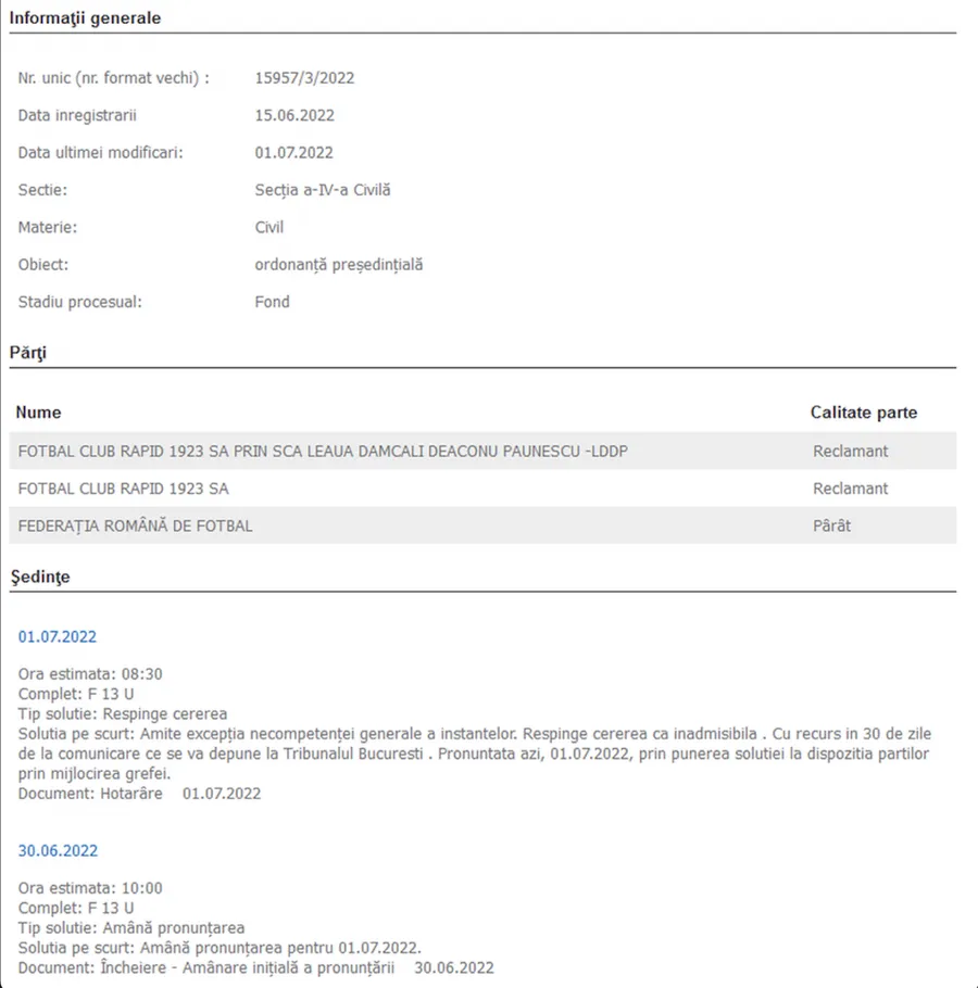 „Soluția pe scurt: Amite excepția necompetenței generale a instanțelor. Respinge cererea ca inadmisibilă. Cu recurs în 30 de zile de la comunicare ce se va depune la Tribunalul București. Pronunțată azi, 01.07.2022, prin punerea soluției la dispoziția părților prin mijlocirea gafei”, se arată pe portal.just.ro.