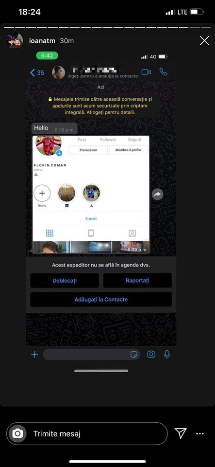 Asta nu e tot! Hackerii au contactat-o pe Ioana Timofeciuc, iubita lui Florinel Coman, pe WhatsApp pentru a discuta despre contul fotbalistului de la FCSB, iar tânăra a făcut numărul aceluia public pe pagina sa de Instagram.