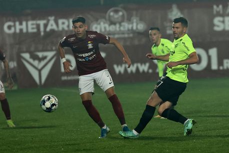 Cristian Sapunaru (S), de la Rapid, lupta pentru balon cu Mihai Bordeianu (D), de la CFR Cluj in meciul de fotbal din etapa a XII-a a Ligii 1, disputat pe stadionul Orasenesc din Mioveni, duminica, 17 octombrie 2021. GEORGE FILIP / MEDIAFAX FOTO