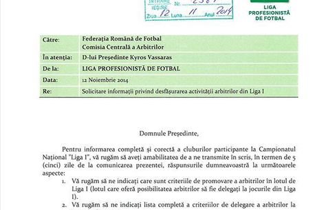 Războiul pornit de conducătorii de cluburi din Liga 1 împotriva arbitrilor a căpătat miercuri contur concret pe site-ul LPF, unde a fost publicată o adresă ultimativă semnată de Gino Iorgulescu, președintele Ligii, către Comisia Centrală a Arbitrilor. Conflictul mocnește de ceva vreme și a izbucnit luni, în ședinta Comitetului Executiv al FRF. Reprezentanții cluburilor au cerut luni mai multe lucruri, inclusiv demisia lui Alexandru Deaconu, cel care conduce de facto CCA în lipsa președintelui Vassaras, aflat mai mult în Grecia