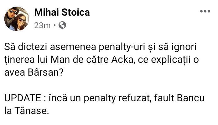 UPDATE: încă un penalty refuzat, fault Bancu la Tănase”, a scris Meme Stoica, directorul sportiv al celor de la FCSB, pe contul său de Facebook.