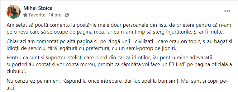 Pentru că sunt și suporteri steliști care pierd din cauza idioților, iar pentru mine adevărații suporteri au contat și vor conta mereu, promit că sâmbătă voi face un FB LIVE pe pagina oficială a clubului. Nu cenzurez pe nimeni, răspund la orice întrebare, dar fac apel la bun simț. Mai sunt și copii pe-aici”, a scris Meme Stoica pe contul său de Facebook.