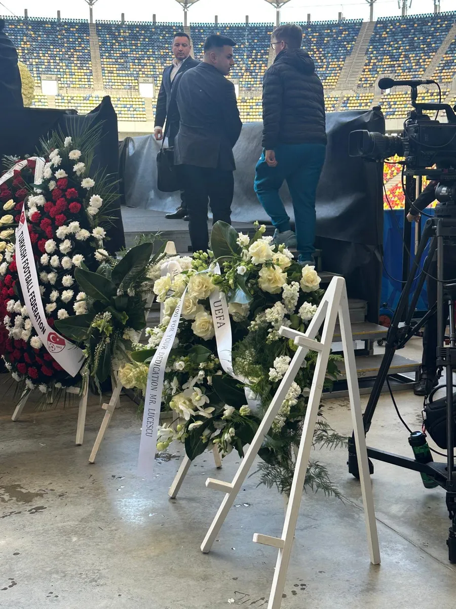 FRF a organizat un culoar spre catafalcul cu sicriul în care se află trupul lui Mircea Lucescu, unde pot fi văzute multe fotografii din cariera lui Il Luce.