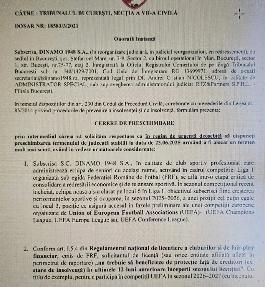 ProSport a aflat o nouă mișcare strategică pe care administratorul judiciar RTZ și administratorul special – Andrei Nicolescu au pus-o la cale zilele trecute. Astfel, joi, 12 iunie, dinamoviștii au formulat o cerere de preschimbare de termen în dorința de a câștiga zile importante sub povara obținerii licenței europene pentru sezonul 2026-2027.