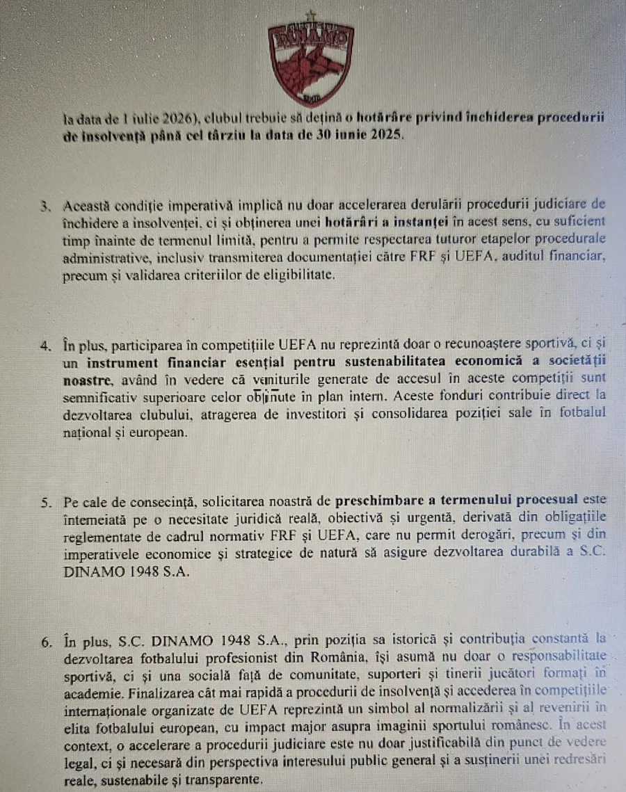 Administratorul judiciar al SC Dinamo 1948 SA a formulat, în urmă cu o săptămână, raportul cu propunerea de ieșire din insolvență a debitoarei SC Dinamo 1948 SA. Zilele trecute, mai precis joi, administratorul special Andrei Nicolescu s-a adresat din nou judecătorului sindic cu o nouă cerere menită să urgenteze reintegrarea cât mai rapidă a societății în circuitul economic. Miza? Obținerea licenței sportive pentru cupele europene.