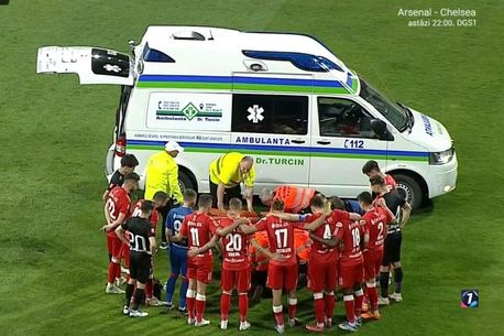Ambulanța a pătruns imediat pe teren, iar coechipierii au făcut paravan în jurul lui Rareș Pop. După primele îngrijiri medicale oferite pe gazon, Rareș Pop a fost urcat, în cele din urmă, în ambulanță și a fost scos de pe teren.