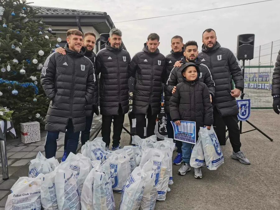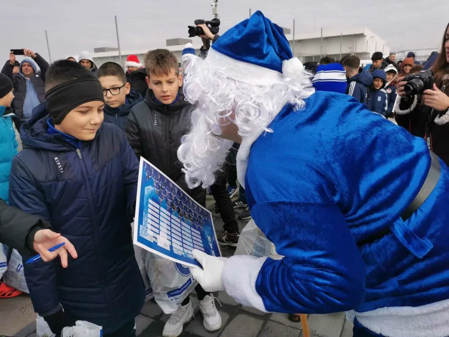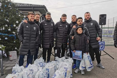 Moș Crăciun, foștii jucători ai lui FCU, dar și actualii jucători ai lui Giovanni Costantino au împărțit cadouri juniorilor alb-albaștrilor din Bănie.