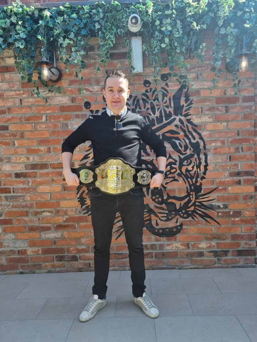 Alex Radu „Alecu” și centura lui Conor McGregor, expusă la restaurantul sportivului din Dublin