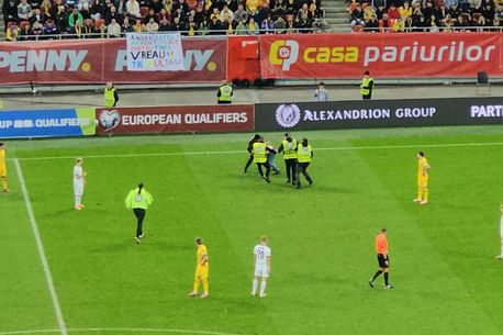 Un suporter a reușit să pătrundă pe suprafața de joc în timpul meciului dintre România și Austria, din preliminariile Campionatului Mondial 2026, disputat pe Arena Națională din București.